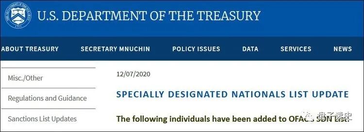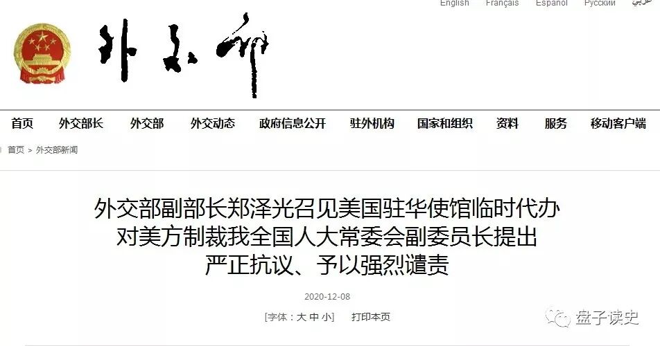 2020年12月7日,美國宣佈對14名中國官員實施製裁。這14名中國官員均為全國人大副委員長。