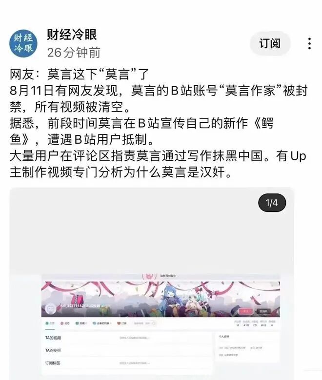 莫言这下"莫言"了!8月11日有网友发现,莫言的B站账号"莫言作家"被封禁,所有视频被清空。