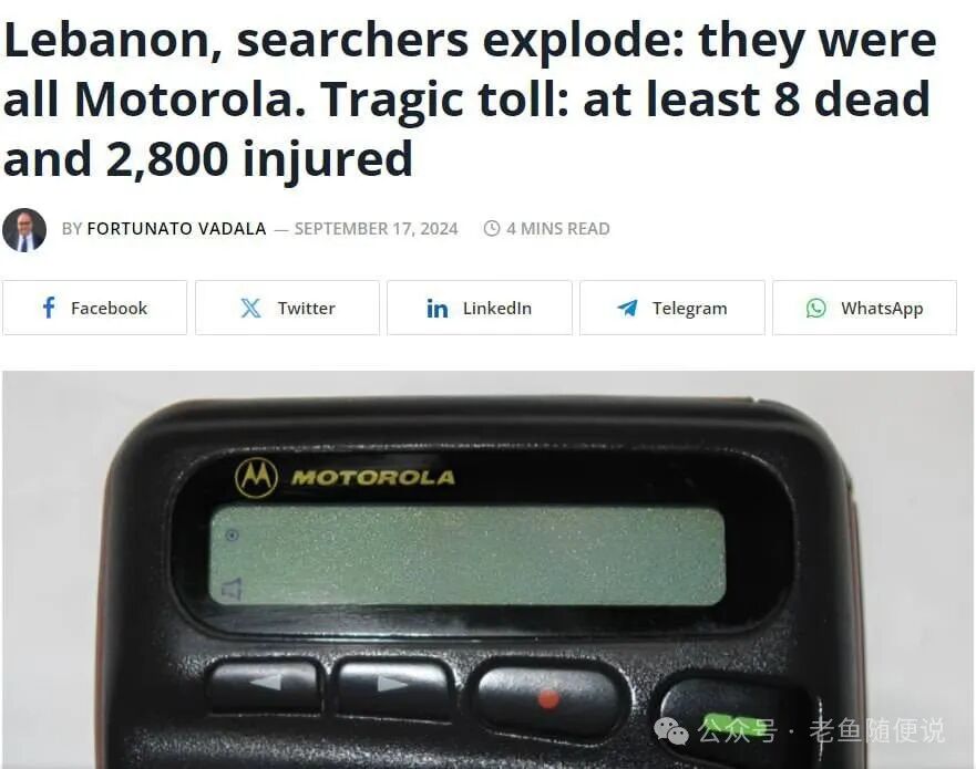 一开始有消息说:爆炸的寻呼机是台湾某公司生产的,在运输的途中被以色列特工截获,给装了炸药。还有人说是美国摩托罗拉公司生产的,所以新闻爆出后,把摩托罗拉的股票价格都给打下来了。